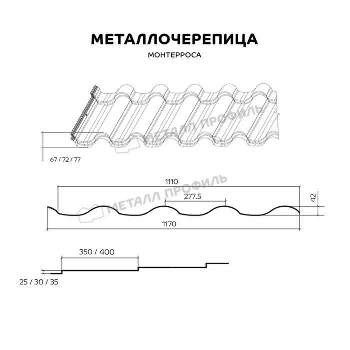 Представляем вашему вниманию новый выразительный профиль стальной черепицы — МОНТЕРРОСА. Его полная глубина составляет 67, 72, 77 мм. С МОНТЕРРОСА кровля становится похожа на традиционную (керамическую). Широкий верх волны притягивает внимание, скаты смотрятся необычно. В интернет-магазине представлена металлочерепица с различными вариантами длины (350 либо 400 мм) и высоты (25, 30, 35 мм) ступеней. Подарите вашей крыше очарование плавных выразительных линий традиционного профиля!