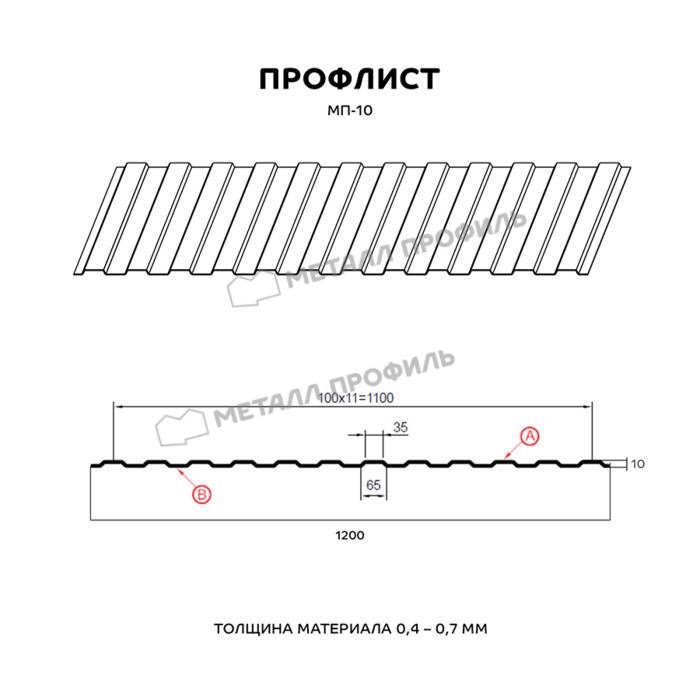 МП-10 – разновидность стандартного стенового профнастила. Он замечательно подходит в виде декоративного ограждения, подвесного потолка в нежилых помещениях, забора, вентилируемого фасада, стенового материала. Профлист характеризуется трапециевидной формой гребня, аналогичной с двух сторон. Глубина гребня – 10 мм, что не даёт металлопрокату высокой способности выдерживать большие нагрузки, но при оформлении стен это не самое главное. Зато сдержанный рельеф профлиста не создаёт постройке промышленный облик. На прочностные качества можно повлиять, выбрав различную толщину стали. Этот профиль прокатывается в вариантах от 0,4 до 0,7 мм. Увеличить защиту от ржавчины способен финишный полимерный слой. Он не только отличается богатым цветом, устойчивым к выгоранию под ультрафиолетом, но и предупредит небольшие физические повреждения и корродирование металла.